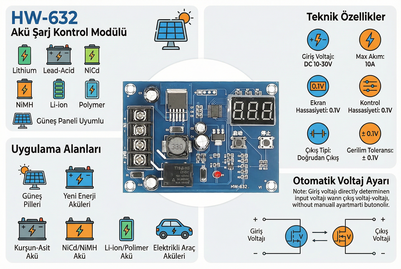 HW-632, lityum pilleri, kurşun asit, nikel-kadmiyum, nikel-metal hibrit, lityum-iyon ve polimeri aküleri şarj etmek için kullanılan bir şarj kontrol modülüdür. Modül güneş panelleri için de kullanılabilir. Giriş voltajına uygun olarak çıkış veren ekranlı bir şarj koruma devresidir.