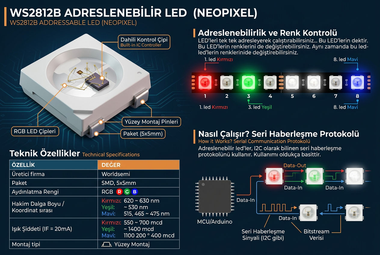 Adreslenebilir led'leri diğer led'lerden ve şerit led'lerden ayıran özellik; led'leri tek tek adresleyerek çalıştırabilmenizdir. Örneğin 8 led'ten oluşan adreslenebilir ledleriniz var. Bu led'lerin 1.sini 3. ve 8. sini çalıştırabilirsiniz. Aynı zamanda bu led'lerin renklerinide değiştirebilirsiniz. 1.led kırmızı yanarken 3.led yeşil, 8.led mavi olarak çalışabilir.